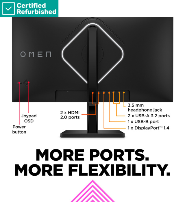 RENEW SILVER OMEN by HP 27qs QHD Gaming Monitor - 27" 2560x1440 QHD 400-nit 240Hz AG, IPS, 2x HDMI/DisplayPort, 2x USB-A, speakers, height adjustable/tilt/pivot, 1 years HP RENEW