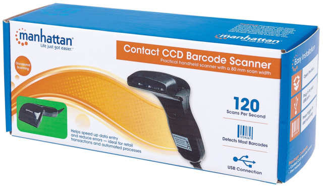 Manhattan Contact CCD Handheld Barcode Scanner, USB, 80mm Scan Width, Cable 152cm, Max Ambient Light: 3,000 lux (sunlight), Must, Three Year Warranty