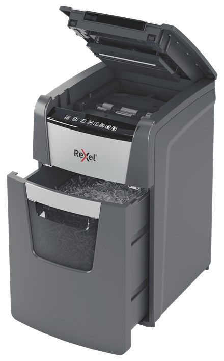 Model name AutoMax 150C | Cutting capacity in sheets 80g/m2 150 | Can shred Staples/Credit cards/Paper clips/CDs/DVDs | Waste collection capacity 32 l | Colour Black