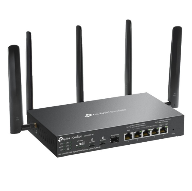 TP-LINK Omada 4G+ Cat6 AX3000 Gigabit VPN Gate with 4-Port PoE+PORT: 1× Gigabit SFP WAN/LAN Port, 1× Gigabit RJ45 WAN Port, 4× Gigabit WAN/LAN ER706WP-4G